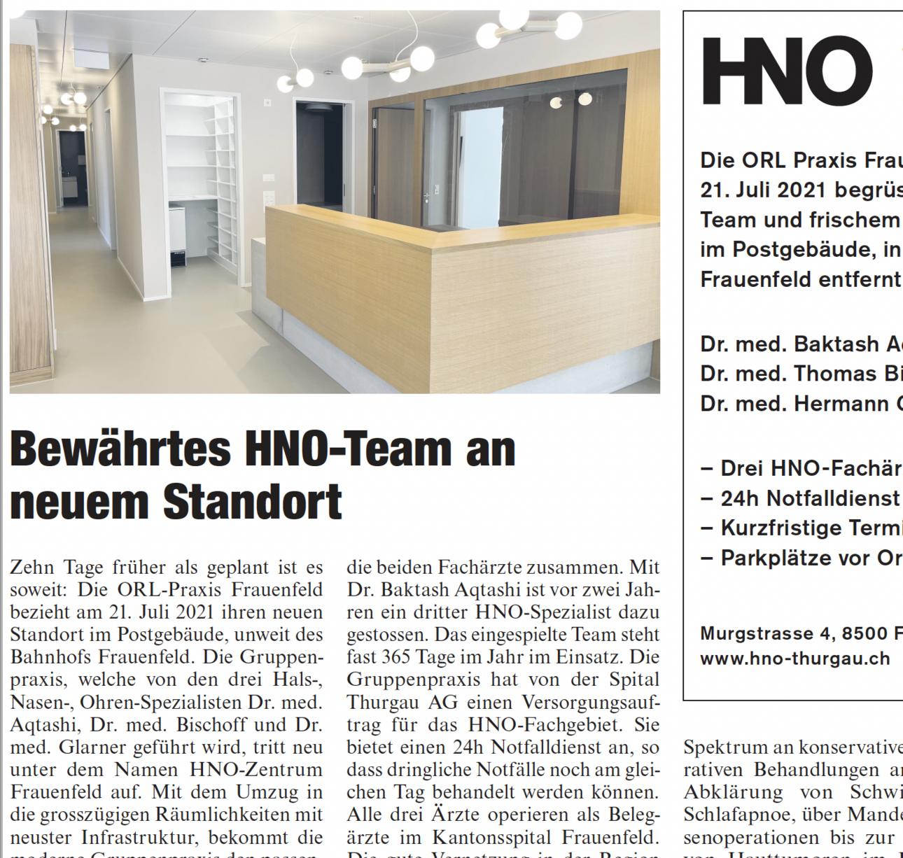 Zehn Tage früher als geplant ist es soweit: Die ORL-Praxis Frauenfeld bezieht am 21. Juli 2021 ihren neuen Standort im Postgebäude, unweit des Bahnhofs Frauenfeld.