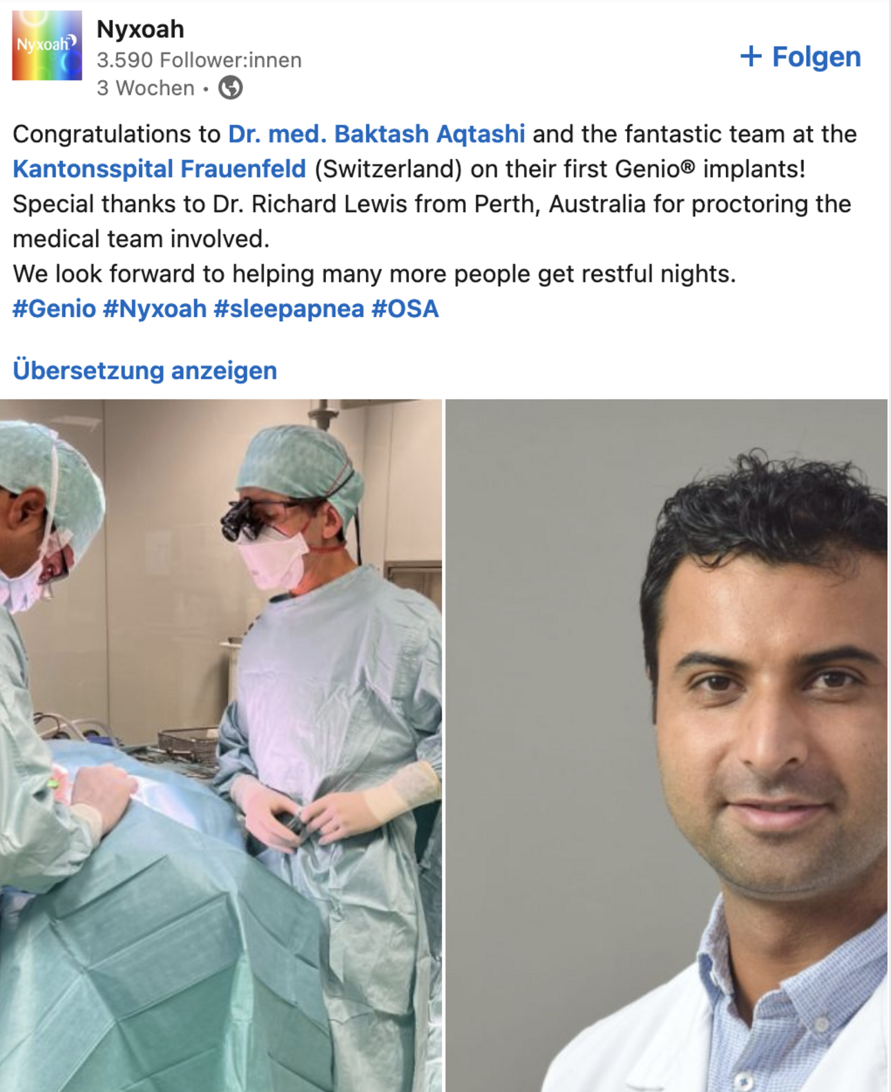 Erstes Genio-Implantat von Dr. med. Baktash Aqtashi und dem Team des Kantonsspital Frauenfeld. Wir freuen uns darauf, viel mehr Menschen zu erholsamen Nächten zu verhelfen!